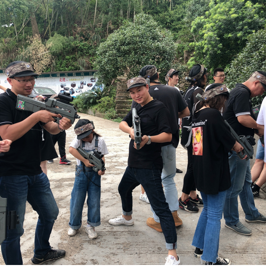 稍作休息后,大家期待的第二項活動-真人CS。在教官的一聲問好中拉開了序幕,風(fēng)馳團(tuán)隊高聲回答“好,很好,非常好”的口號響徹云霄,振興士氣。教官看了都夸贊我們是有組織,團(tuán)隊凝聚力很強(qiáng)的團(tuán)隊。教官先給大家分成了4小組,每組成員為17人,以車輪戰(zhàn)的方式來決定最后勝利的一組,獲勝小組將會獲得價值2800元的獎品。聽到獎品的價值各小組成員兩眼放光,蠢蠢欲動。大家熟悉裝備使用以及了解游戲規(guī)則后,游戲正式開始了。