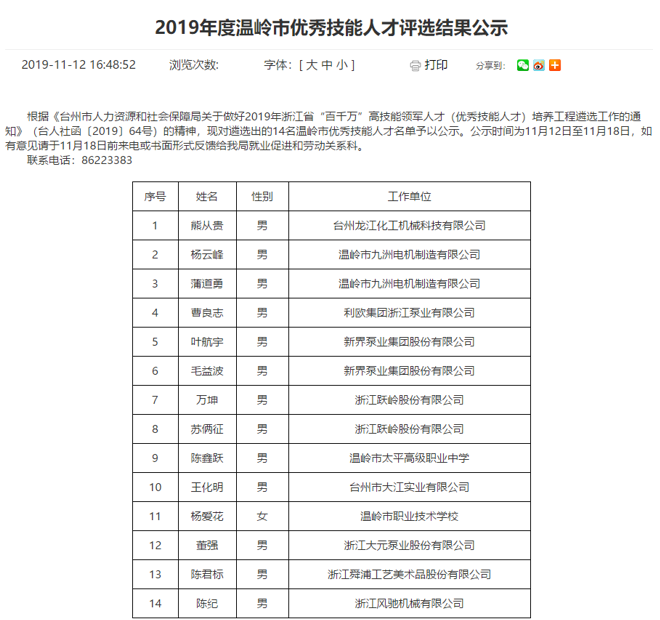 為高水平建設(shè)人才強省,進(jìn)一步加快高技能人才隊伍建設(shè),我司根據(jù)《臺州市人力資源和社會保障局關(guān)于做好2019年浙江省“百千萬”高技能領(lǐng)軍人才培養(yǎng)工程遴選工作的通知》要求,通過我司推薦,經(jīng)資格初審、評委會評審等環(huán)節(jié),我司研發(fā)中心陳紀(jì)被評選為溫嶺市優(yōu)秀技能人才,并在網(wǎng)上予以公示,符合公司的價值觀 “客戶為先、誠信負(fù)責(zé)、團(tuán)隊合作、務(wù)實創(chuàng)新”精神。
