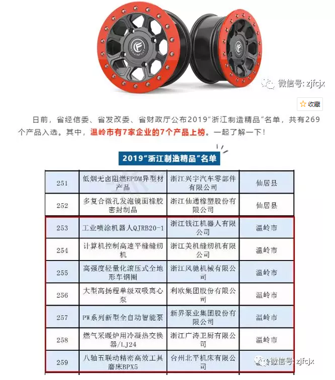 為全面提升“浙江制造”品牌形象,深入推進實施“四換三名”工程,推動企業(yè)提升創(chuàng)新能力、品牌培育和市場開拓力度,扶持并推廣應用一批“技術先進、設計新穎、質量可靠、效益優(yōu)良”的浙江制造產品,公司響應風馳于2019響應政府號召積極參與“浙江制造精品”申報,通過省經信委、省發(fā)改委、省財經廳聯(lián)合開展評選,風馳的《高強度輕量化滾壓式全地形車鋼圈》上榜入選為2019“浙江制造精品”名單,同時根據(jù)市政府鼓勵企業(yè)開發(fā)新產品的規(guī)定,公司將予以獲得30萬元的獎勵。